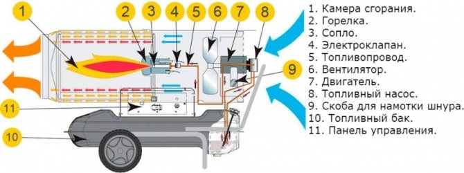 Les pistolets à chaleur diesel sont des dispositifs mobiles sûrs qui se composent d'un réservoir de carburant, d'une pompe ou d'un compresseur, d'une chambre de combustion, d'un brûleur et d'un ventilateur. Des modèles diesel avec des puissances nominales de 2,5 à 100 kW peuvent être trouvés sur le marché moderne. Séparément, il existe de puissants pistolets thermiques industriels d'une capacité de 140 à 160 kW.