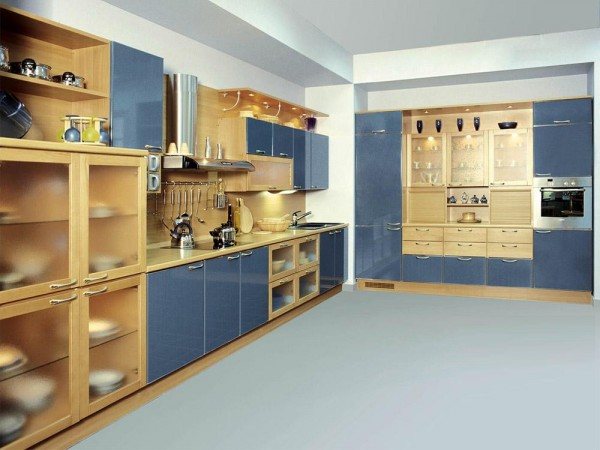 Une autre option consiste à utiliser un casque en forme de L prêt à l'emploi et à l'installer dans le coin. Cette solution convient aux cuisines spacieuses (plus de 9 m2). Dans ce cas, à l'endroit où se trouve la boîte de ventilation dans la cuisine, il sera conseillé d'installer un meuble bas pas très profond, qui aura des étagères ouvertes.