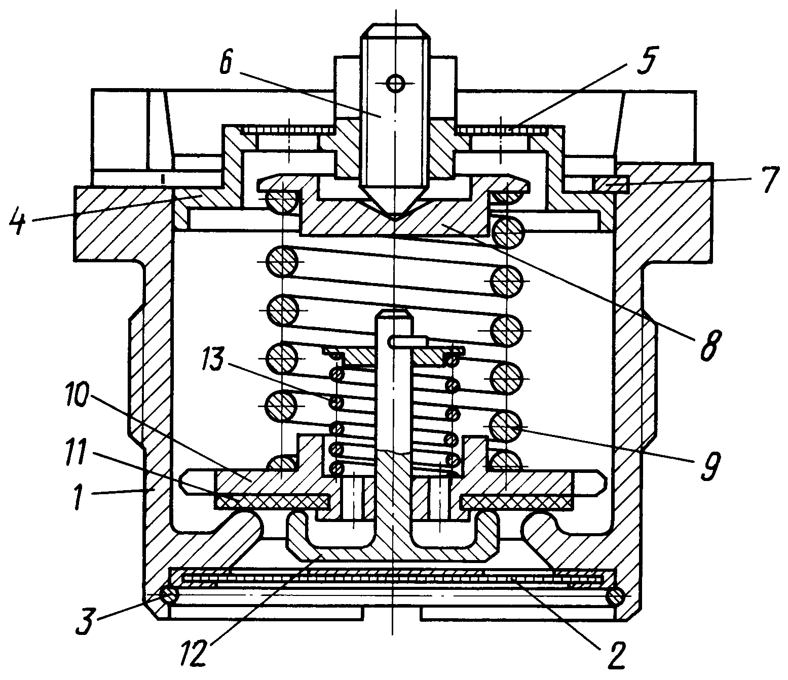 Lorsque la pression sur le diaphragme est supérieure à celle réglée, le ressort est comprimé, il s'ouvre et la pression est relâchée à travers le trou latéral. Lorsque la pression dans le système ne peut pas surmonter l'élasticité du ressort, le diaphragme revient à sa position d'origine.