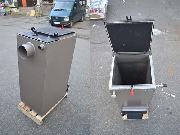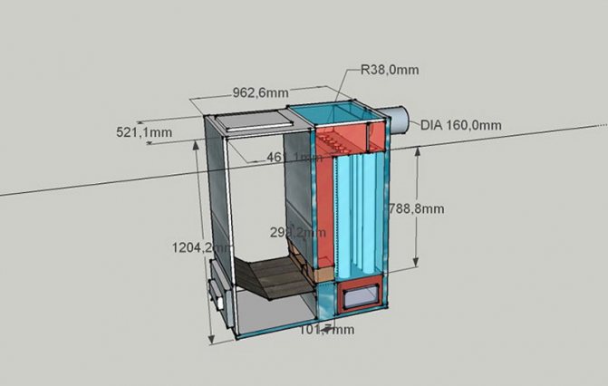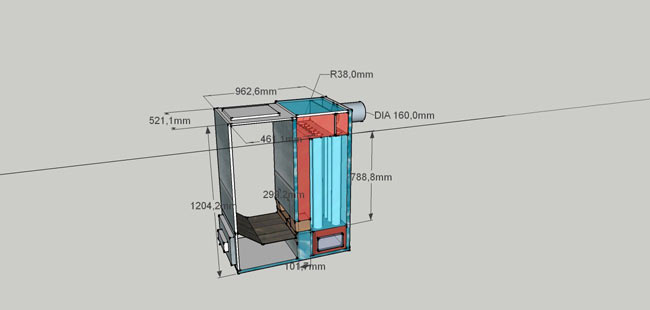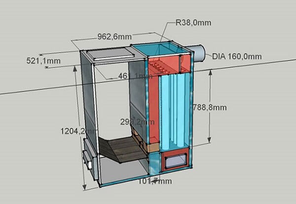 L'air est injecté dans la chambre à cendres par un canal à partir d'un profil de 60 x 40 mm, chauffé par la paroi arrière de la chambre de combustion. Le ventilateur et l'unité d'automatisation sont installés par le haut, ce qui les protège de la poussière et de la saleté.Tous les détails de conception sont indiqués dans les dessins, que vous pouvez utiliser comme base pour l'autoproduction.