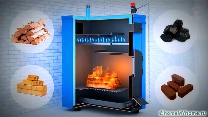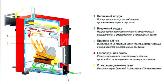 Les analogues prenant en charge la combustion à long terme diffèrent des chaudières ordinaires par la présence de deux chambres de travail à la fois. Dans le premier d'entre eux, le carburant directement incorporé est brûlé, et dans le second, les gaz libérés. L'approvisionnement en oxygène en temps opportun joue un rôle important. Un ventilateur conventionnel avec une automatisation simple peut être utilisé comme dispositif de soufflage d'air.