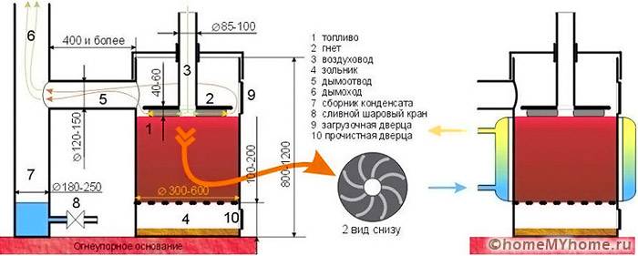Vous demandez - pourquoi la pressurisation forcée? Ceci est nécessaire pour éviter le fameux régime de combustion lente et pour brûler des combustibles solides de manière économique. Le principe de fonctionnement est le suivant:
