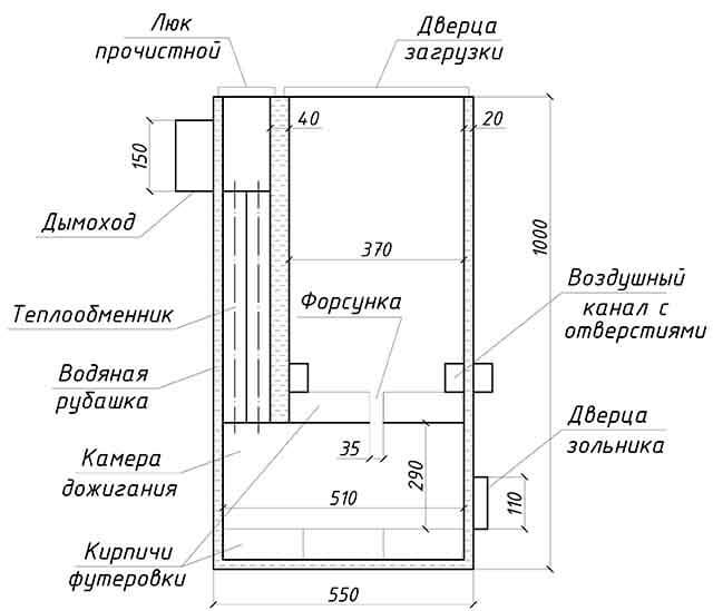 Avant d'acheter des matériaux, vous devez calculer la puissance minimale d'une chaudière de mine à combustion longue et dessiner ou trouver un dessin de l'appareil dans des sources ouvertes.