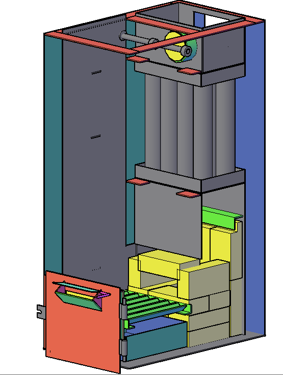 - Le bois de chauffage (ou charbon) est chargé jusqu'en haut dans une chambre de combustion d'un volume de 112 dm³ et allumé. Après cela, toutes les portes sont fermées hermétiquement et les automatismes sont mis en marche, commençant le soufflage d'air par le ventilateur.