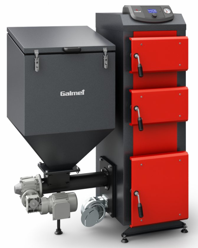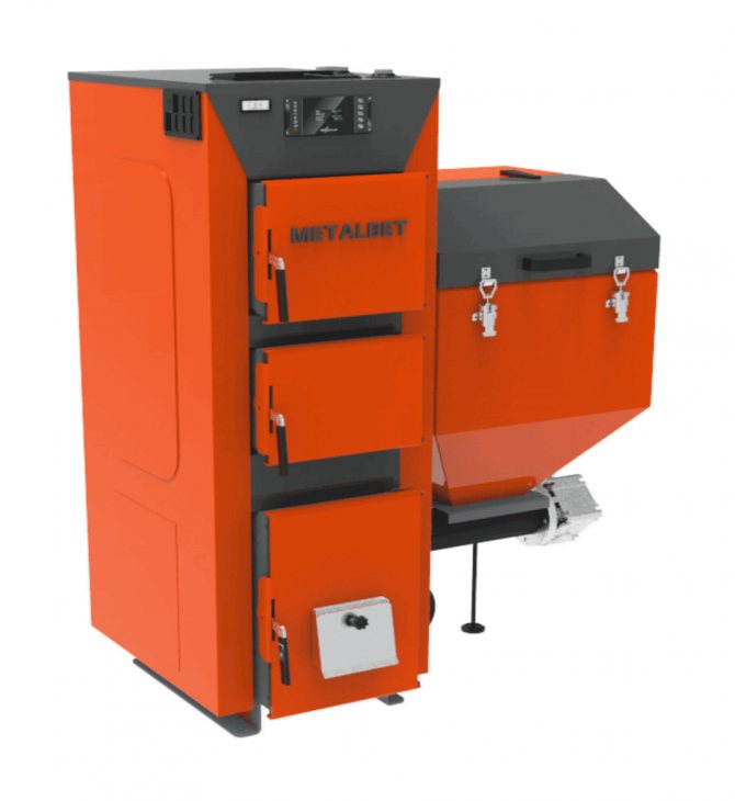 Un représentant frappant de ce type de radiateurs est une chaudière à charbon automatique de la marque Heiztechnik, équipée, en plus des unités principales, d'un circuit d'alimentation en eau chaude, d'une pompe de circulation et d'un contrôleur programmable avec la possibilité de connecter des thermostats externes. Le contrôleur contrôle le fonctionnement du brûleur et peut l'arrêter à tout moment, ce qui est un avantage significatif pour les unités à combustible solide. Un autre avantage est la possibilité de mettre la grille en peu de temps, de retirer le brûleur et de continuer à travailler avec la combustion directe traditionnelle du combustible dans le four. L'efficacité de l'unité est déclarée par le fabricant au niveau de 88%.