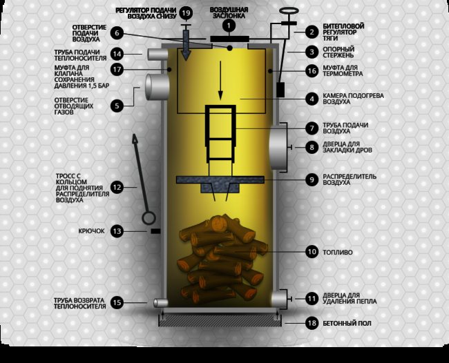 Le principe de fonctionnement de ces appareils est assez simple. Le carburant est placé dans la première chambre de combustion. Avec peu d'admission d'air, le bois brûle et libère du gaz de pyrolyse. qui entre dans la deuxième chambre. Ici, le gaz est brûlé et chauffe le fluide caloporteur du système de chauffage domestique.