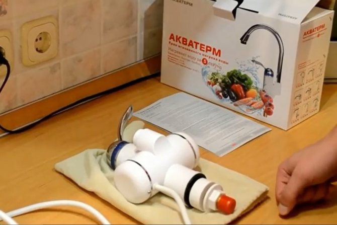 - Buse de chauffage séparée. L'appareil est placé sur le bec du robinet précédemment installé. Il n'est pas nécessaire d'effectuer des travaux d'installation complexes. Les inconvénients de la buse sont une faible puissance, une faiblesse de la pression. L'appareil ne chauffe pas plus de 4 litres de liquide par minute. Les dimensions compactes ne permettent pas de compléter les appareils de chauffage avec des modules de sécurité complexes. Il n'y a qu'un capteur thermique qui ne permet pas la combustion du composant chauffant.
