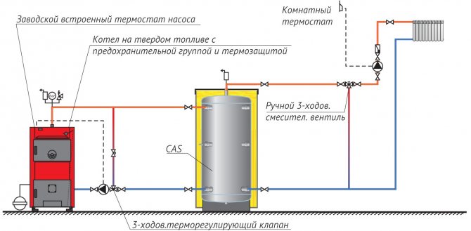 Bien sûr, il y en a. Une partie de l'énergie générée lors de la combustion peut être facilement redirigée vers l'accumulateur de chaleur. Cela peut être un grand réservoir d'eau, de la maçonnerie ou même un réservoir de sable - si vous êtes assez courageux pour prendre la décision. La combustion efficace du bois dans une chaudière de chauffage, en particulier dans une maison avec une bonne isolation thermique, nécessite la libération rapide d'une grande quantité d'énergie générée lors du fonctionnement optimal de la chaudière. La meilleure solution serait d'utiliser un réservoir d'eau supplémentaire appelé accumulateur de chaleur. Grâce à lui, une chaudière à pleine charge peut fonctionner pendant plusieurs heures à une puissance nominale, ce qui peut largement dépasser le courant requis dans les locaux. Cela n'entraîne pas de surchauffe de la maison, car un excès d'énergie s'accumule dans l'accumulateur de chaleur, en raison de la capacité thermique élevée de l'eau. Le liquide de refroidissement est fourni aux radiateurs du système de chauffage non pas directement à partir de la chaudière, mais à partir d'un accumulateur de chaleur avec un mélange de liquide de refroidissement résiduel de la conduite de retour à l'aide d'une vanne à trois voies.