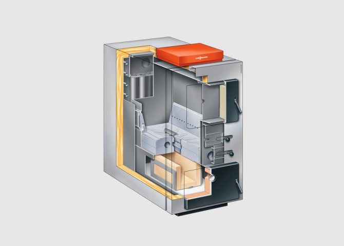 Le carburant brûle de haut en bas. Par conséquent, ces chaudières fonctionnent longtemps avec une seule charge.