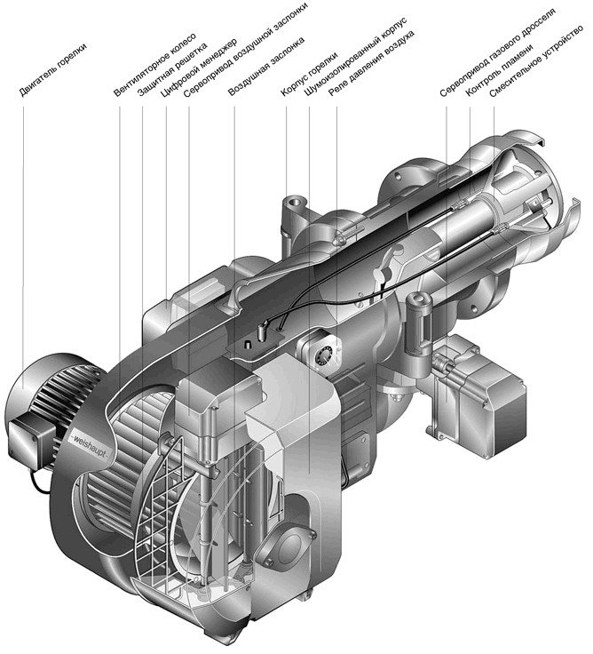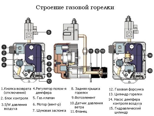 Un brûleur à gaz se compose de plusieurs unités: une buse, un système d'allumage, un système d'automatisation et un détecteur de flamme.
