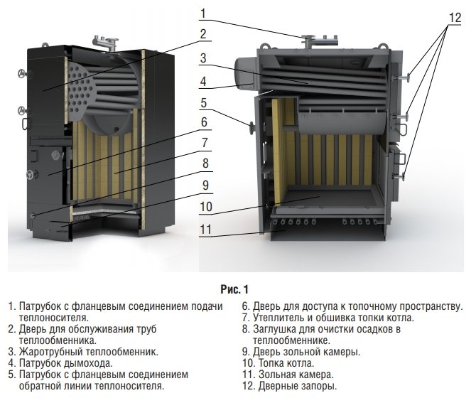 La flamme du combustible brûlant chauffe les plaques d'argile réfractaire du four, ses parois intérieures et le fond du tambour, et les produits de combustion chauds résultants traversent les tuyaux de chauffage de l'échangeur de chaleur de sorte qu'en dégageant de la chaleur pour l'eau en circulation, ils se refroidissent et sont retirés de la chaudière par la cheminée.
