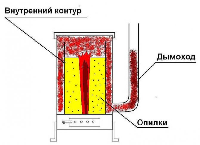 En principe de fonctionnement, ainsi qu'en fabrication, les dessins de la chaudière sur sciure aideront à comprendre, Fait main. Un registre optionnel est installé à l'extrémité du tuyau afin de réguler la quantité d'air entrant et le taux de combustion. Pendant le fonctionnement de l'unité, la charge dans la chambre de combustion est abaissée jusqu'à ce que tout le combustible ait brûlé. Les produits de combustion sont évacués de la fournaise par la cheminée.