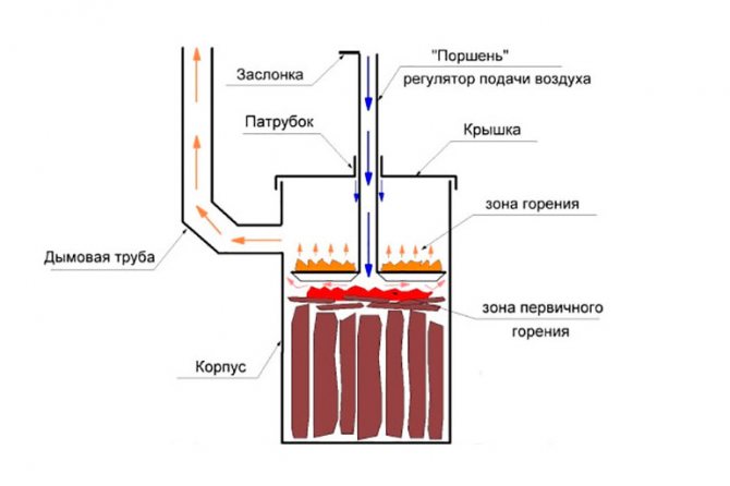 Le four de la chaudière n'a pas de portes ni de cendrier, mais est chargé de combustible par le haut, du bas jusqu'à la coupe de la cheminée. La biomasse chargée est pressée sur tout le plan par un poids rond en tôle d'acier épaisse, et un tuyau vertical y est soudé, à travers lequel l'air est fourni au four. Ce tube traverse le couvercle supérieur fermé et dépasse librement. La chaudière est allumée par son extrémité supérieure. La particularité réside dans le fait que la couche supérieure du carburant brûle, le processus va de haut en bas, réchauffant la chemise d'eau.