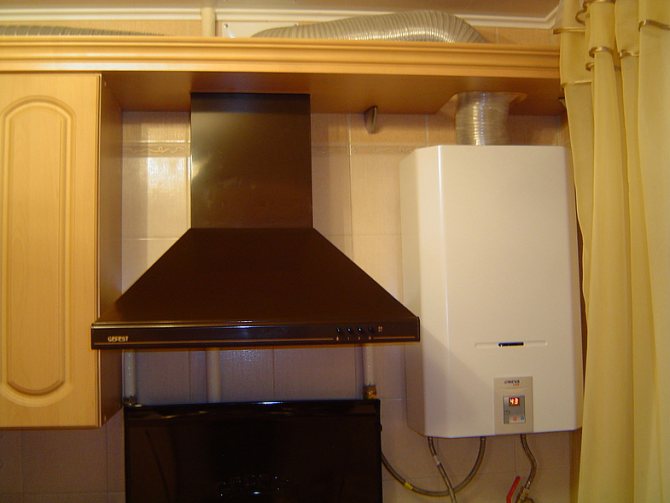 Habituellement, pour le fonctionnement d'une colonne avec une chambre de combustion ouverte dans un appartement en ville, la ventilation naturelle de la pièce est suffisante, ce qui est assuré par la présence d'une fenêtre dans la pièce et d'un conduit de ventilation non bouché. Dans le même temps, de nombreux propriétaires de colonnes envisagent d'installer un capot supplémentaire afin d'augmenter la sécurité et d'augmenter la traction. En fait, si la poussée est suffisante, de telles actions ne sont pas nécessaires. Au contraire, l'installation d'une hotte au-dessus d'une colonne peut entraîner les problèmes suivants: