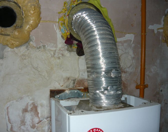 S'il n'y a pas de cheminée dans la pièce où le chauffe-eau à gaz est installé, un tuyau principal ou amovible est monté. Il est permis de connecter temporairement des équipements à gaz à la cheminée du poêle s'ils ont les performances nécessaires.