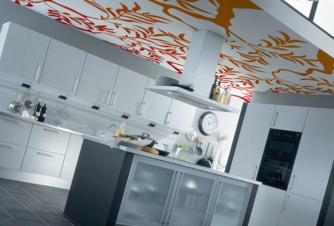 Important! Pour la cuisine, les experts conseillent de choisir un film PVC - il est plus facile à nettoyer et il n'y a pas de stries. Mais le plafond en tissu, ayant une surface structurelle, est plus obstrué par la poussière, la saleté et la suie.Par conséquent, si la cuisine est petite, ils y cuisent souvent beaucoup, alors le tissu est une option moins appropriée pour de tels endroits.