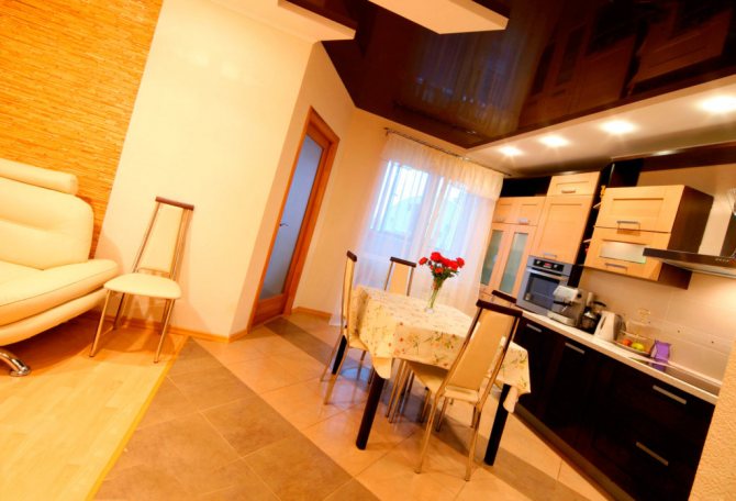 Cette option de finition est idéale pour les cas où il est nécessaire de cacher les fils électriques, les tuyaux de gaz et de ventilation des regards indiscrets. Le plafond tendu est spectaculaire et élégant, complétant parfaitement n'importe quel intérieur. La conception des structures suspendues est également diversifiée, les surfaces à plusieurs niveaux avec des sources lumineuses intégrées semblent très extraordinaires. Cependant, de tels systèmes réduisent la hauteur du plafond de 10 à 20 centimètres, ce qui n'est pas toujours acceptable.