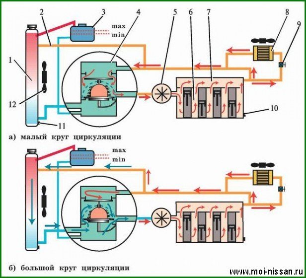 La fonction principale du système de refroidissement est de maintenir la température de fonctionnement du moteur à 98-103 ° C. Lorsque le moteur est en marche, la chaleur des pièces de travail est évacuée à l'aide d'un liquide de refroidissement qui circule constamment dans le système.Pendant que le moteur chauffe, l'antigel ou l'antigel se déplace en un petit cercle sans passer par le radiateur. Le thermostat est fermé à ce moment.
