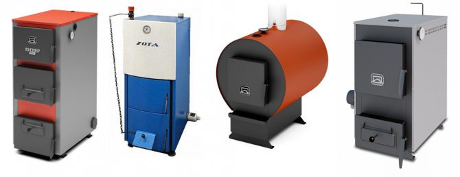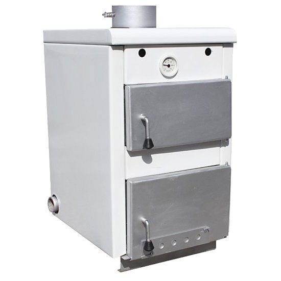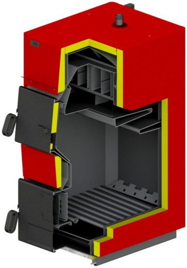 La conception de ces chaudières est traditionnelle: du combustible solide est brûlé dans la chambre de combustion, les parois de la chambre sont un échangeur de chaleur, à l'intérieur duquel un liquide de refroidissement circule dans le système. Le chargement du carburant se fait par la porte avant, les cendres sont collectées dans le cendrier par le bas.
