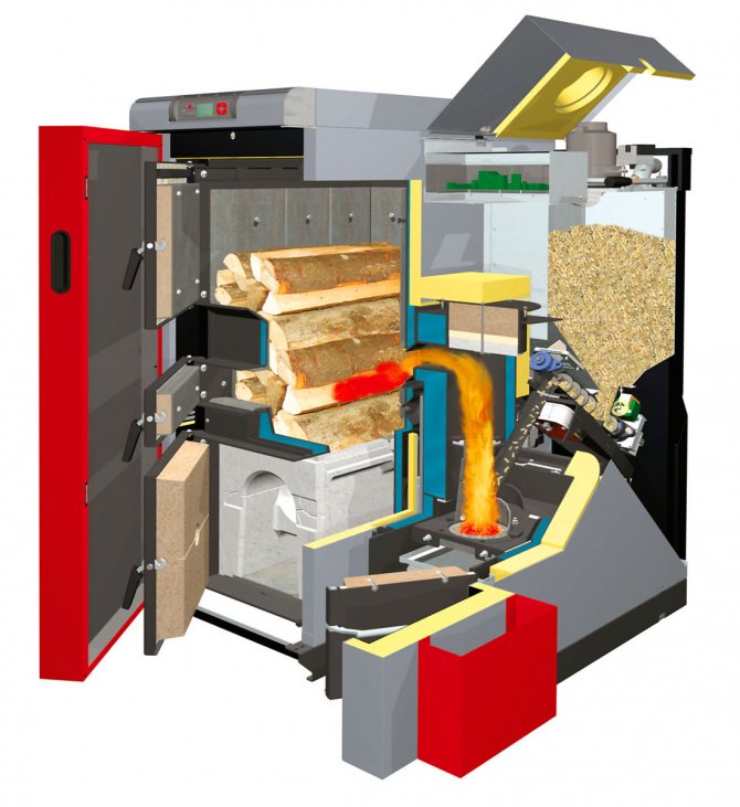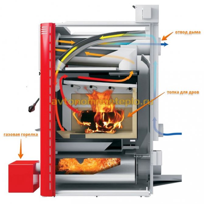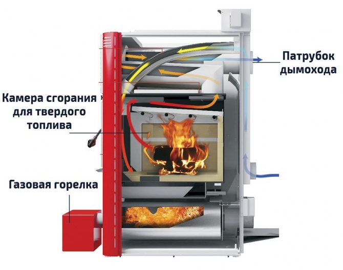 - Caractéristiques de conception - comme déjà noté, les chaudières multi-combustibles peuvent avoir une chambre de combustion universelle conçue pour l'utilisation alternée de gaz et de bois de chauffage, ou des fours séparés pour chaque type de combustible. La deuxième option est préférable en raison du fait que le transfert de la chaudière du bois de chauffage au gaz est effectué automatiquement.