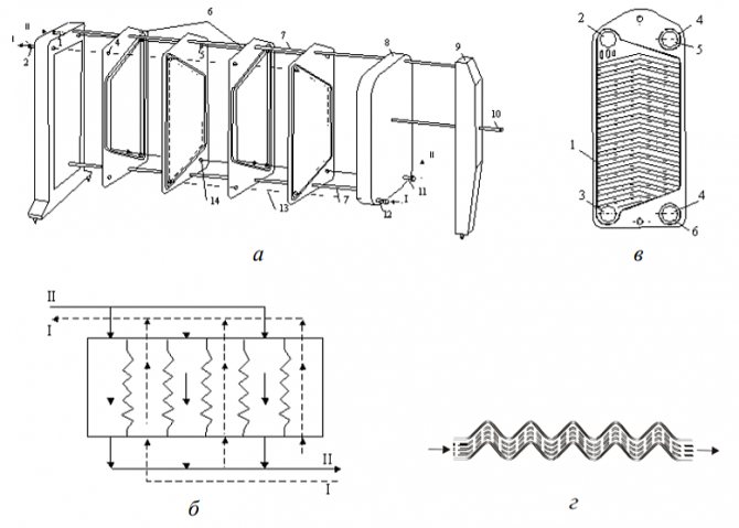 Un échangeur de chaleur à plaques pour l'alimentation en eau chaude se compose de plusieurs plaques ondulées situées sur un cadre rigide. Ils sont identiques dans leur conception et leurs dimensions, cependant, ils se suivent, mais selon le principe de la réflexion du miroir, et sont divisés entre eux par des joints spécialisés. Les joints peuvent être en acier ou en caoutchouc.