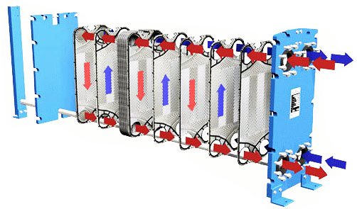 Le principe de fonctionnement d'un échangeur de chaleur à plaques pour le chauffage est assez simple. Prenons un exemple où la source de chaleur est une chaudière à eau chaude. Dans la chaudière, le fluide caloporteur chauffe jusqu'à une température prédéterminée, puis la pompe de circulation fournit ce liquide de refroidissement à l'échangeur de chaleur à plaques. L'échangeur de chaleur à plaques se compose d'un ensemble de plaques. Le liquide de refroidissement chauffant, circulant à travers les canaux de la plaque d'un côté, transfère sa chaleur au liquide de refroidissement chauffé, qui s'écoule de l'autre côté de la plaque. En conséquence, le liquide de refroidissement chauffé augmente sa température jusqu'à la valeur calculée et pénètre dans les appareils de chauffage (par exemple, les radiateurs), qui dégagent déjà de la chaleur dans la pièce chauffée.