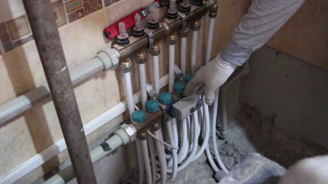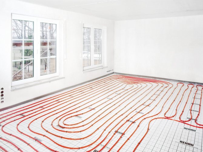 Chauffage au sol à eau. Le fluide chauffant est dilué avec des tuyaux PE-RT.