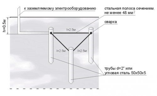 Une structure de mise à la terre est immergée dans un trou creusé de forme triangulaire complexe. Tout d'abord, les racks sont martelés aux coins du triangle, après avoir été immergés sous le niveau du sol (leur longueur doit être de 1,5 à 3 m pour une immersion verticale), des conducteurs horizontaux leur sont soudés. La section des conducteurs horizontaux ne doit pas être inférieure à celle des poteaux verticaux.