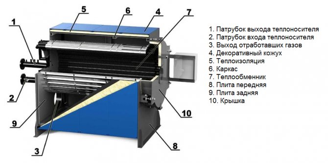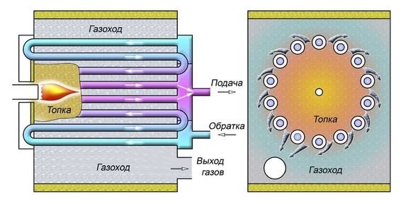 - Dans la deuxième version de la chaudière, le caloporteur se déplace à l'intérieur des tubes de l'échangeur de chaleur, qui sont situés autour du brûleur. Les tuyaux sont disposés à proximité les uns des autres et constituent les parois de la chambre de combustion.