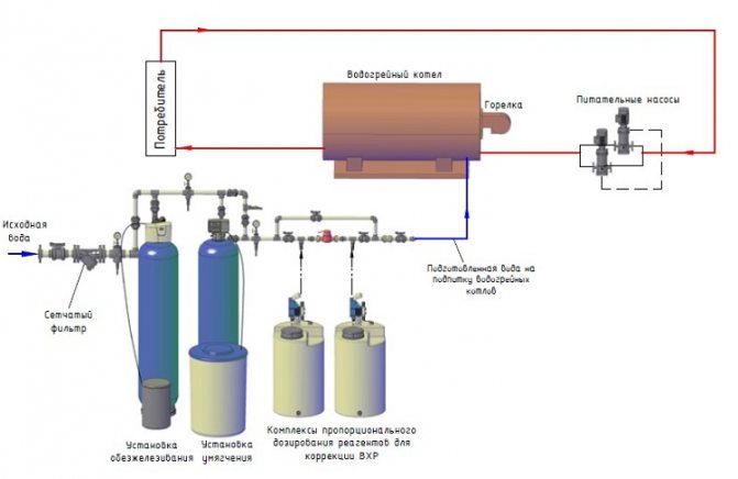 Si une chaudière à eau chaude est utilisée non seulement pour chauffer l'objet, mais également pour fournir de l'eau chaude, le système de traitement de l'eau est appliqué à tout le liquide entrant.