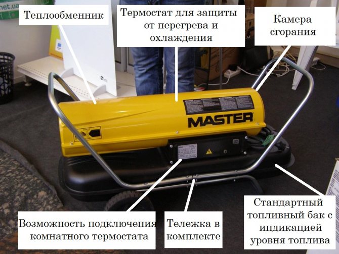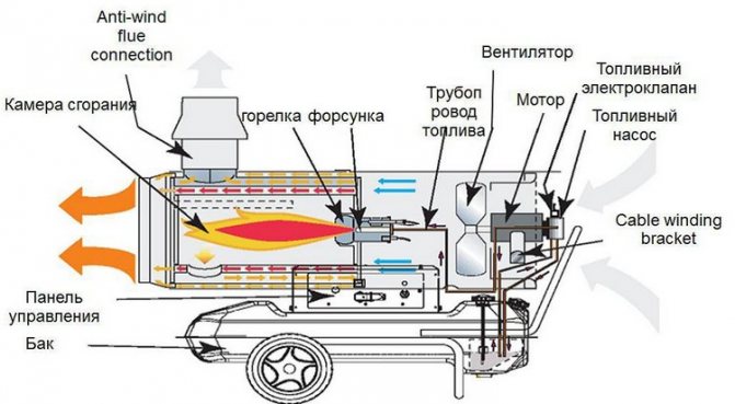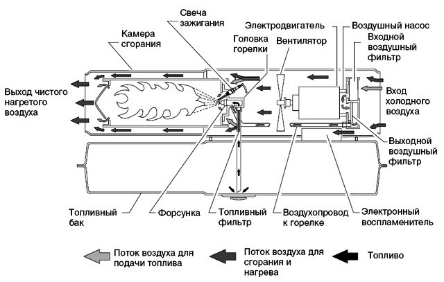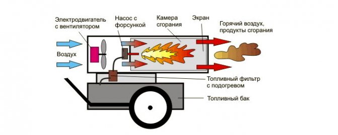 La conception des pistolets thermiques diesel avec élimination des gaz d'échappement contient une chambre fermée dans laquelle le carburant est brûlé et une cheminée. Le carburant est fourni sous pression à la buse, dans la chambre il est pulvérisé sous forme d'aérosol et s'enflamme. L'air est soufflé à l'intérieur de l'unité par un ventilateur. Pour maintenir le processus de combustion, une partie de l'air pénètre dans la chambre par les trous situés à l'arrière. Le reste du flux se déplace entre le boîtier de chauffage et la chambre de combustion, où il est chauffé. La fumée quitte la chambre par la cheminée et est évacuée à l'extérieur, en contournant la pièce.