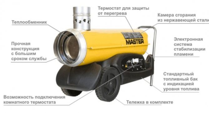 De plus, ces structures sont équipées d'une minuterie, d'un thermostat et de systèmes de contrôle de la combustion. Le carburant est fourni à l'aide d'une buse ou d'un compresseur, après quoi le carburant est enflammé dans la chambre de combustion. Il est préférable d'utiliser un canon pour un garage, équipé d'un tuyau pour évacuer les gaz d'échappement vers la rue.