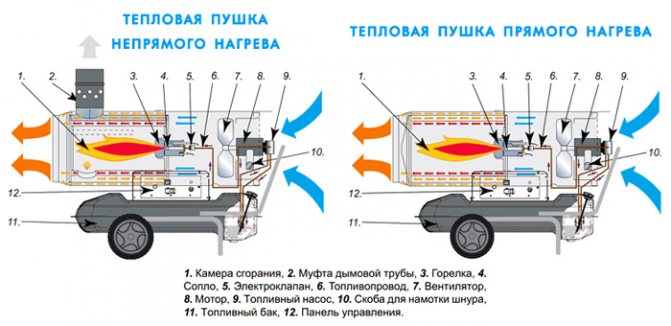 La première option est utilisée plus largement, par exemple, pour le chauffage des locaux civils, industriels, d'entrepôt, agricoles et domestiques. Cela est dû au fait que la conception prévoit une cheminée à travers laquelle les produits de combustion sont évacués. C'est pourquoi ce type de pistolet thermique est utilisé dans les locaux d'habitation.