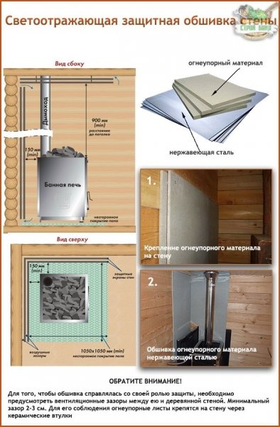 Un exemple populaire de revêtement utilisant une feuille de métal est un tel "gâteau": mur - espace de ventilation (2-3 cm) - isolation (1-2 cm) - feuille d'acier inoxydable. La distance entre le mur en bois et le poêle est d'au moins 38 cm (SNiP 41-01-2003).