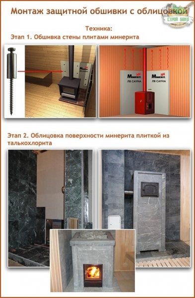 La gaine de protection avec le respect obligatoire de la fente de ventilation a un coefficient d'absorption de chaleur très faible, de sorte que le mur en dessous ne chauffe pratiquement pas. De plus, l'utilisation de bardage permet de déguiser le «gâteau» protecteur pour résister à la finition du hammam dans le même style.