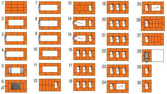 Tout cela reste à recouvrir de brique rouge résistante à la chaleur (de préférence chauffée au rouge, qui a déjà subi un chauffage jusqu'à plusieurs milliers de ° C). La structure de pose peut être plate ou avec une bobine (c'est-à-dire un coude bouclé le long de la cheminée, ce qui vous permet de laisser plus de chaleur dans la pièce qu'avec un système de soufflage direct).
