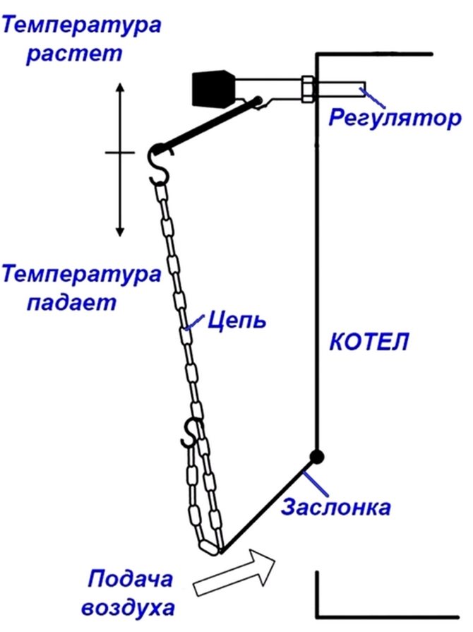 Le contrôle du volet de la chaudière ou de la porte du ventilateur du four par l'opérateur (pompier) modifiait la quantité d'oxygène dans le four et modifiait la température du fluide caloporteur dans un sens ou dans l'autre (en raison d'une combustion plus ou moins intense). Le principe de fonctionnement d'un appareil mécanique capable de faire ce travail est également assez simple.