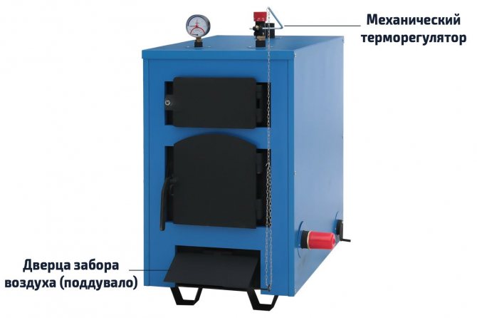 La possibilité d'installer un thermostat mécanique est indiquée par la présence d'un manchon soudé dans le tambour de la chaudière par le côté, par l'avant ou par le haut, de plus, la porte du cendrier doit s'ouvrir vers le haut. Pour les unités dans lesquelles la porte du ventilateur s'ouvre sur le côté, il n'y a toujours pas de régulateurs en série. L'espace autour du boîtier doit permettre à l'appareil d'être facilement monté et ajusté.
