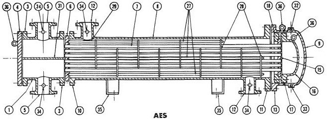 - La figure du haut est une conception avec la possibilité d'extraire le faisceau de tubes sans démonter la tête elle-même, caractérisée par une efficacité thermique réduite en raison de la présence de flux de dérivation (désignation TEMA).