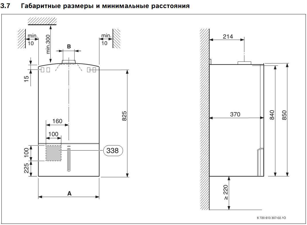 - la distance entre la chaudière et le mur est d'au moins 1300-1500 mm, ce qui est dû à la nécessité d'accéder à l'équipement en cas de panne ou de maintenance préventive;