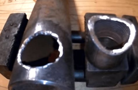 | Nous ajustons le tuyau de dérivation. Un tuyau de dérivation sera soudé par le côté, le second à partir de l'extrémité du tuyau. Tout d'abord, nous devons couper le tuyau latéral pour qu'il s'adapte parfaitement au corps du tuyau. J'ai coupé le tuyau avec une meuleuse, puis je l'ai perfectionné avec une lime ronde. |