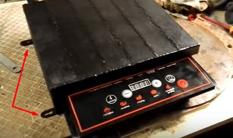 | Nous montons les guides. Afin d'accrocher toute cette structure sur un mur vertical à l'arrière, nous soudons 2 coins, dans lesquels notre poêle à induction sera ensuite inséré, comme dans une niche. |