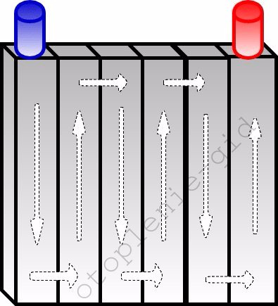 | Diagramme de capacité. Comme le montre le schéma, l'eau circule comme un serpent à travers ce radiateur improvisé. Ce n'est pas par hasard que j'ai fait exactement 6 registres, donc j'aurai l'alimentation et le retour d'un côté et il sera plus facile de connecter le poêle au système de chauffage. |