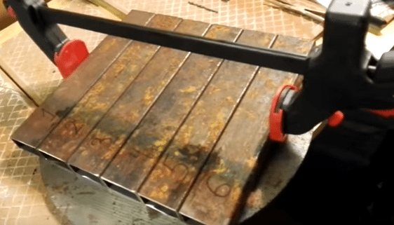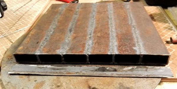 | Nous collectons la capacité. Maintenant, nous devons faire bouillir toutes les coutures entre les tuyaux, pour cela, nous les posons sur une surface parfaitement plane et les serrons avec une pince. De plus, pour que le poêle ne mène pas, nous saisissons d'abord toutes les coutures par point, puis nous soudons soigneusement les coutures. |