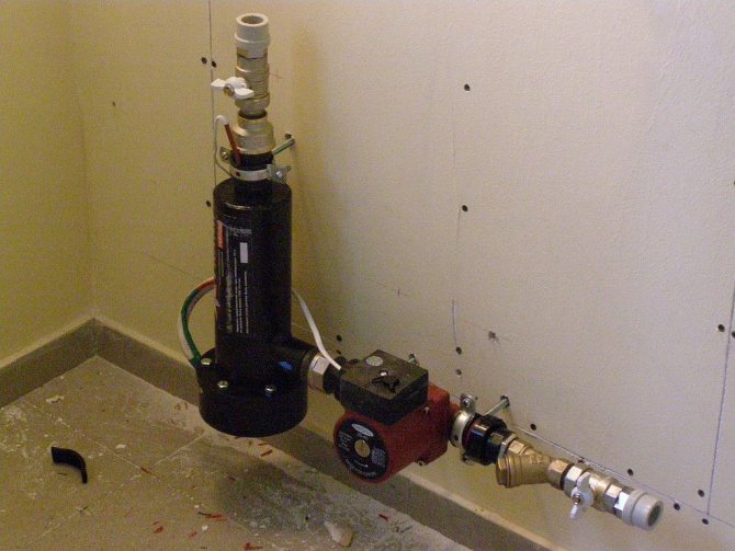 - Après cela, un élément chauffant moins puissant (environ 0,9 kW) est connecté au tuyau de dérivation supérieur, qui est équipé d'un thermostat.
