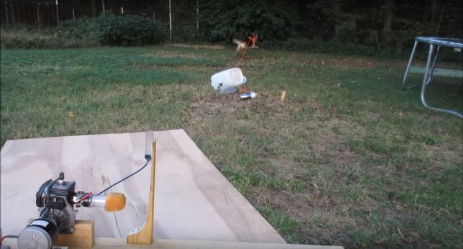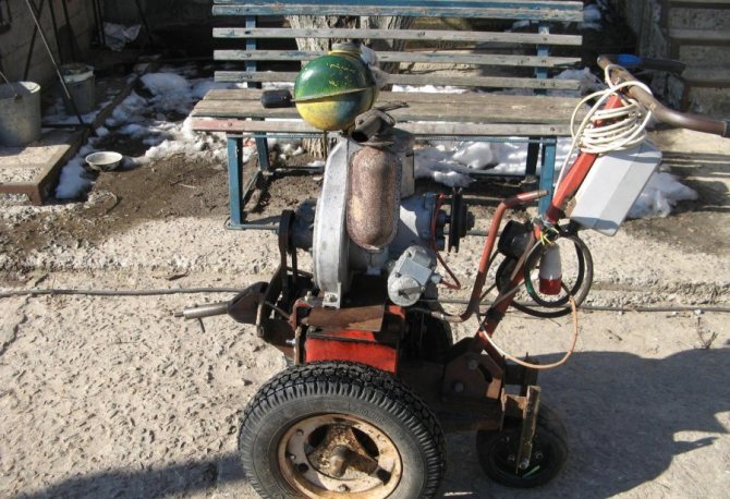 L'auteur disposait déjà d'une plate-forme sur laquelle un moteur avec un générateur était installé à l'avance. Cette conception a été utilisée pour alimenter le moteur avec de l'hydrogène, dont j'ai parlé dans un autre article. Toute cette partie du produit maison qui était responsable de la production et de la fourniture de gaz a été démantelée avec l'aide d'un ami fidèle - un chien de berger. Le moteur à deux temps doit être lubrifié, ce problème a été résolu par l'auteur en fournissant de l'huile au carburateur. Pour fournir du gaz, vous devez adapter un adaptateur au carburateur, qui est fabriqué à partir d'un petit pot en plastique.