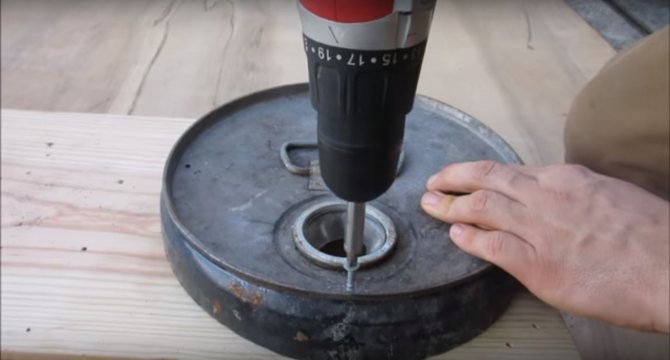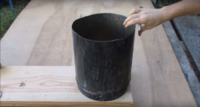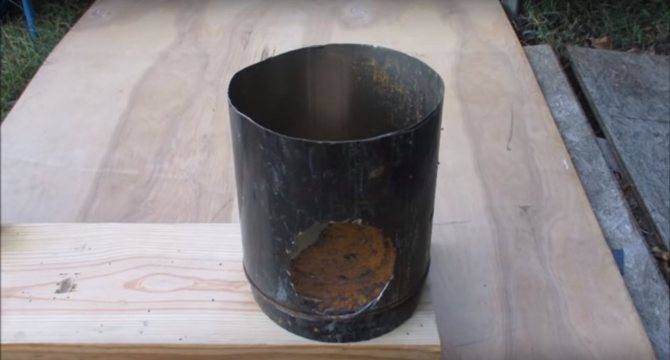 La première chose dont vous avez besoin est une boîte métallique ou quelque chose de similaire. L'auteur coupe le goulot du bidon avec une meuleuse et le visse à la base, nous obtenons ainsi une sorte de palette qui ne permettra pas à la base en bois de prendre feu. Nous mettons une cartouche découpée sur le dessus.