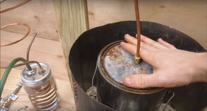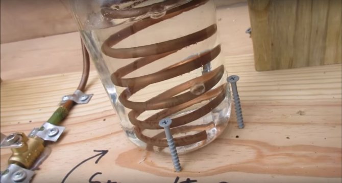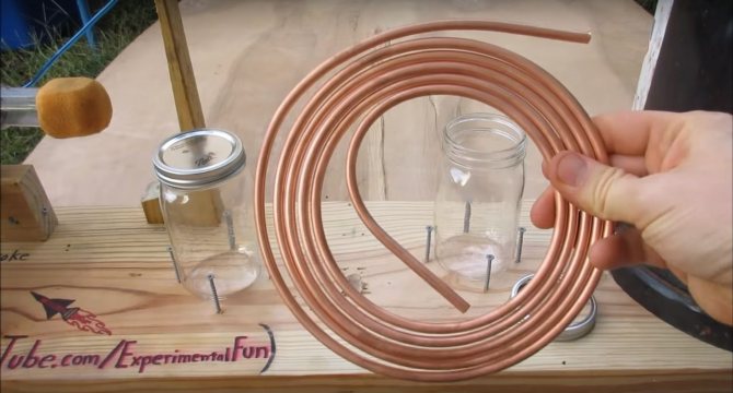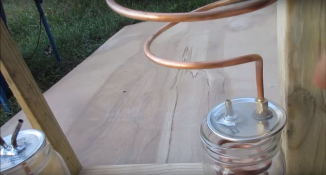 Il y a deux échangeurs de chaleur. Commençons par un petit, il est installé dans une canette, dans laquelle de l'eau est ensuite versée. Nous enroulons la bobine sur un pot d'un diamètre approprié, puis la connectons au raccord installé sur le pot et l'installons à l'intérieur du pot.