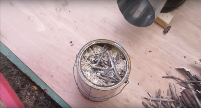 Nous déposons également du bois de chauffage autour du réacteur et ajoutons des copeaux pour un incendie criminel pratique. Il est temps d'y mettre le feu! Préchauffez bien le four, littéralement quelques minutes après, vous verrez des bulles d'air dans le petit échangeur de chaleur. Mais ce n'est pas encore un gaz combustible, mais l'air se dilatant du chauffage sort tout juste.