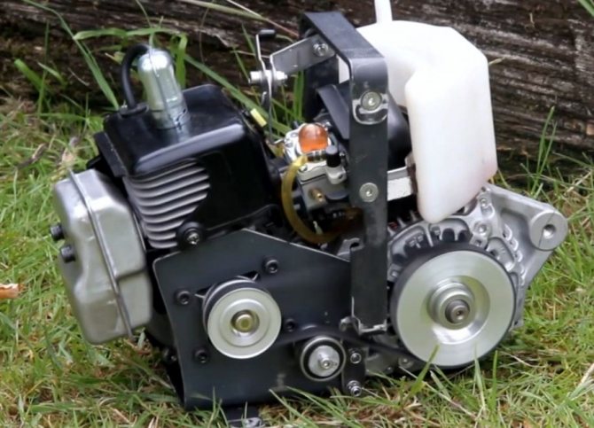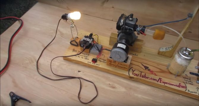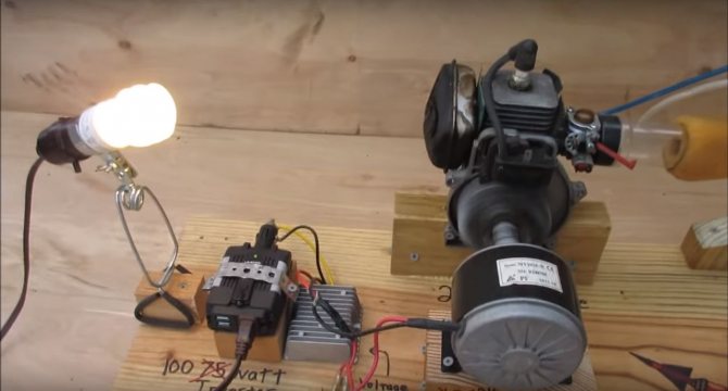 Un moteur électrique est relié à l'arbre du moteur à combustion interne. Il est utilisé comme démarreur puis comme générateur. Le tout est démarré avec une batterie 12V. Un onduleur est connecté au générateur, avec lequel vous pouvez augmenter la tension à 220V et connecter divers appareils ménagers. Pour la démonstration, l'auteur a décidé de brancher une ampoule.